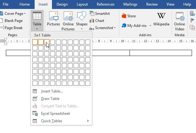 To start this process I will add a table. The table I want to add has only one cell but will contain all the information I wish to show on my document. To add a table please navigate to the 'Insert' tab and select 'Table'. This will bring up a grid in which you can select the row and column amounts you would like. Since we want one I will just select one as seen below: