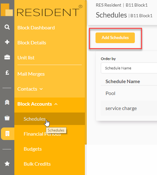 To add a schedule manually we begin by navigating to 'Block' > 'Block Accounts' > 'Schedules.