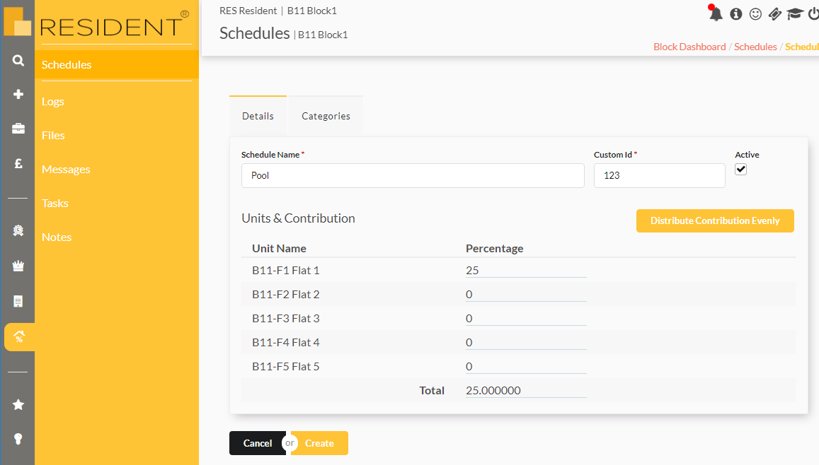 Percentage: Here we can input the percentages for each unit one by one or we can click 'Distribute Contribution Evenly' to automatically work out and assign each unit the same percentage. PLEASE NOTE total percentage can be over or under 100%.