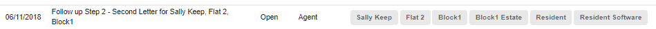 Here you can see that this task was raised for a Leaseholder called 'Sally Keep' in Flat 2. The tags then give the name of the block, estate, client, and agency.