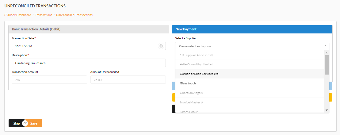 To begin we click the blue ‘Assign Invoice Payment’ button to assign the transaction to an invoice. In the first box we will be able to choose the unit/supplier. If the Unit/Supplier we are reconciling is grey and cannot be selected this will be due to one of the following reasons: