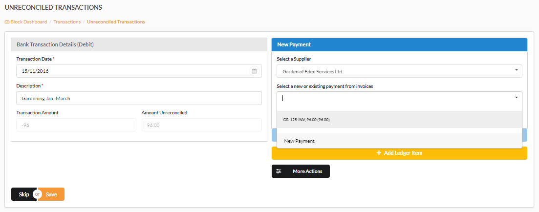The Orange ‘Add Ledger Item’ will create a ledger item against a unit or the whole block. This is best used for cases like bank charges etc.