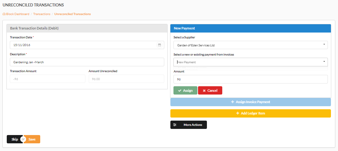 Once we have chosen both the Unit/Supplier and invoice we can go ahead and type in the amount we are reconciling up to the maximum amount of the transaction. Now we can click 'Assign' to register this action. If we have reconciled less than the maximum amount we can add more items before clicking 'Save'. See further down for information on this. Once we are happy we can click 'Save' and this transaction will disappear from the reconciliation page if the full amount has been reconciled. If it has not been met then the transaction will remain on the reconciliation page partially reconciled until complete.