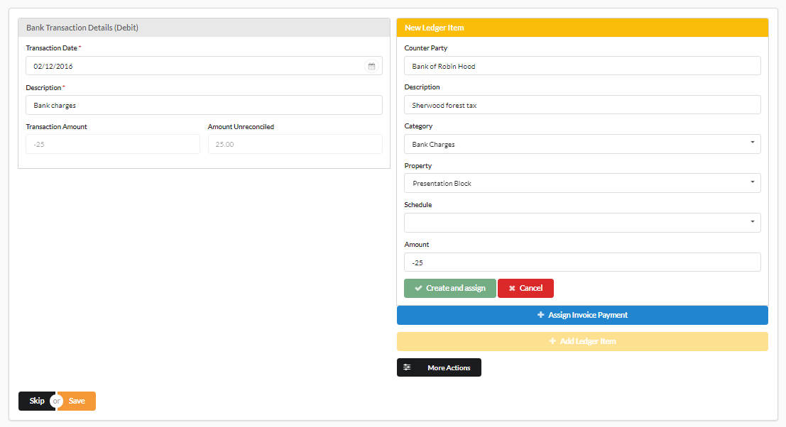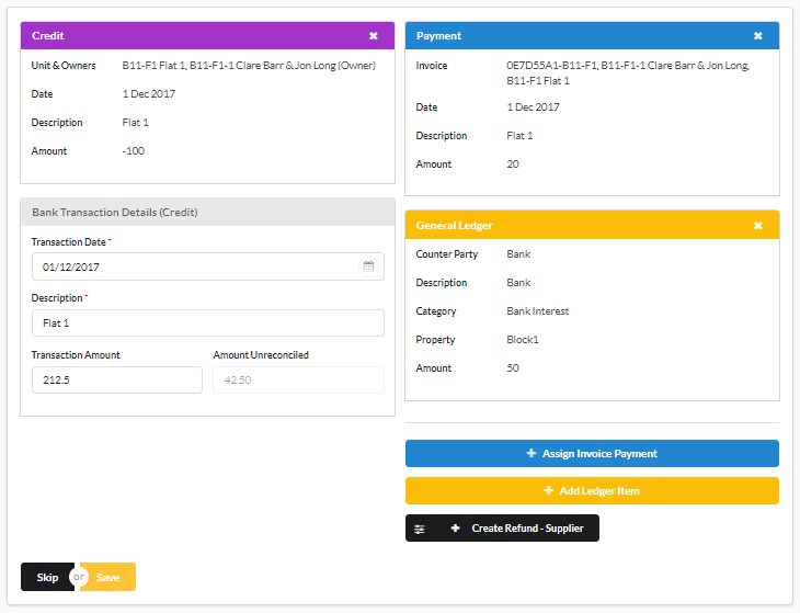 Once we have created the reconciliation we can click ‘Assign’ and either click ‘Save’ or add another to the same transaction if there is still some funds left. We can add as many of these as we would like. They will simply stack like so: